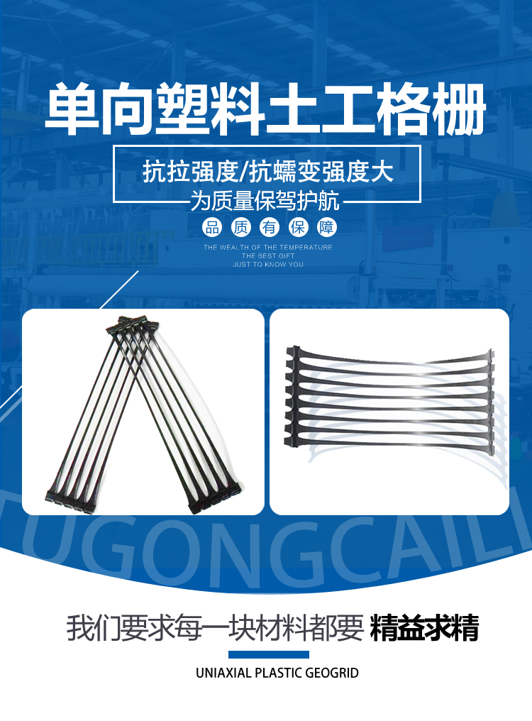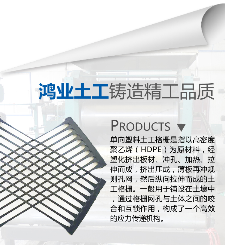單向塑料土工格柵是指以高密度聚乙烯(HDPE)為原材料,經(jīng)塑化擠出板材、沖孔、加熱、拉伸而成,擠出壓成,薄板再?zèng)_規(guī)則孔網(wǎng),然后縱向拉伸而成的土工格柵。一般用于鋪設(shè)在土壤中,通過(guò)格柵網(wǎng)孔與土體之間的咬合和互鎖作用,構(gòu)成了一個(gè)高效的應(yīng)力傳遞機(jī)構(gòu),使局部載荷能迅速有效地?cái)U(kuò)散到大面積的土體中去,從而實(shí)現(xiàn)降低局部破壞應(yīng)力,提高工程使用壽命之目的。